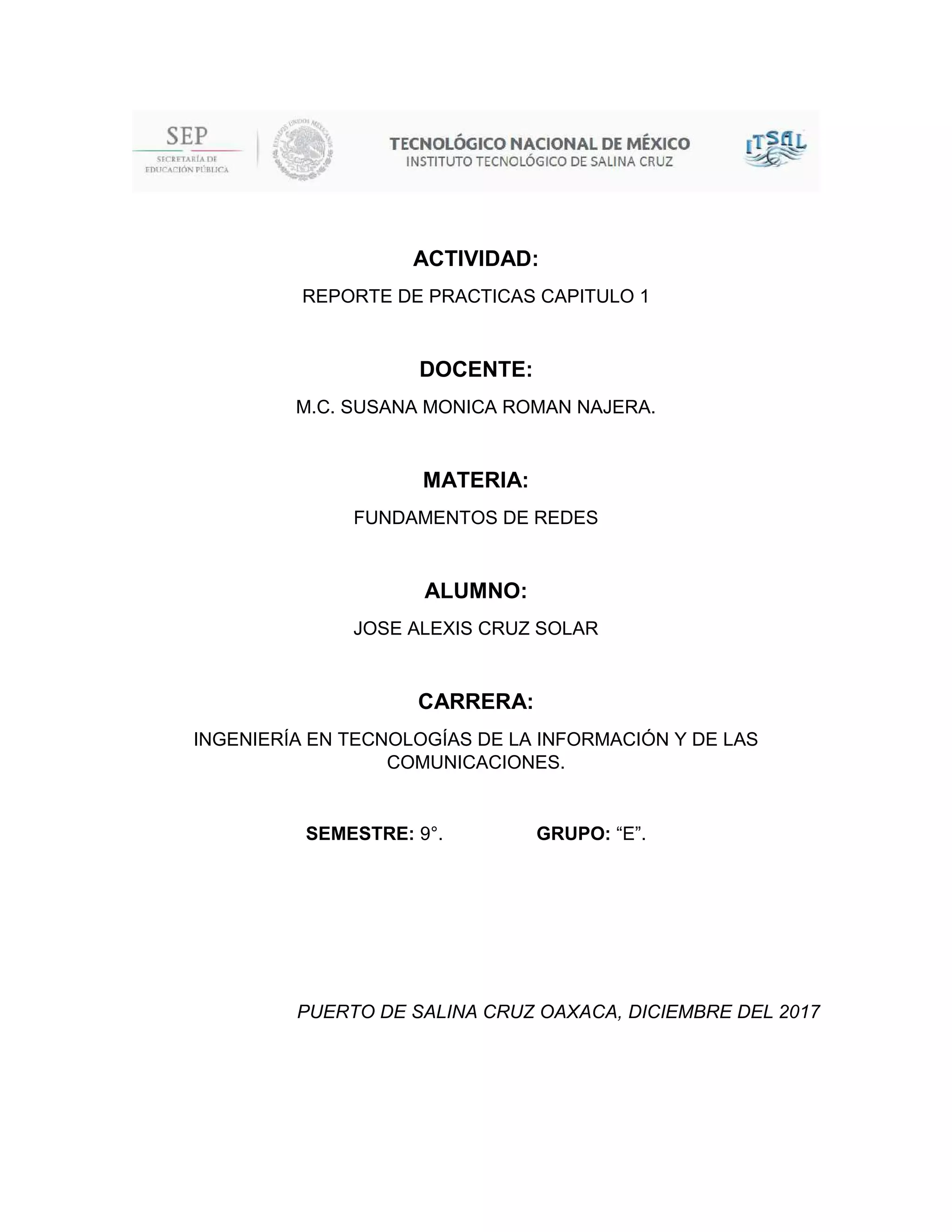 Este documento presenta un resumen de las prácticas realizadas en el Capítulo 1 utilizando el simulador Packet Tracer. El estudiante exploró la interfaz de Packet Tracer y conectó diferentes dispositivos como routers, switches, servidores y PCs. También examinó la configuración y características de cada dispositivo a través de sus fichas físicas, de configuración y CLI. El estudiante concluyó que Packet Tracer es una herramienta útil para simular redes cuando no se cuenta con equipos físicos.
