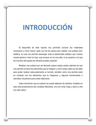 El documento describe los pasos para realizar una pulsera anti-estática, incluyendo una lista de materiales necesarios como velcro, resorte, broches y cable. Explica el procedimiento de cortar y coser los materiales, soldar los cables a los broches y a una resistencia, y concluye que aunque es algo laborioso, construir la pulsera permite aprender sobre sus componentes y hacerla a bajo costo.