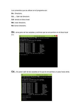El documento describe el símbolo del sistema y los comandos básicos que se pueden usar en él. El símbolo del sistema proporciona una interfaz para escribir comandos de MS-DOS y otros comandos del equipo. Algunos comandos comunes incluyen dir para ver archivos y carpetas, cd para cambiar de directorio, md para crear carpetas y rd para eliminar carpetas.