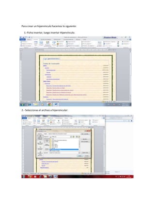Este documento explica cómo crear una tabla de contenido y agregar hipervínculos en un documento. Detalla los pasos para generar una tabla de contenido manual mediante el comando de tabla de contenido y cómo insertar un hipervínculo seleccionando el archivo a vincular desde la opción de hipervínculo en el menú Insertar.