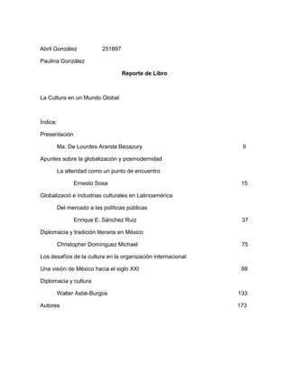 Este documento presenta reflexiones sobre la globalización y la posmodernidad desde una perspectiva cultural. Explora cómo la globalización ha homogeneizado ciertos patrones culturales a nivel mundial, haciendo que las sociedades pierdan parte de sus tradiciones e identidades. También analiza cómo la tecnología y los medios de comunicación masiva han influido en la circulación de bienes y mensajes culturales a nivel global. Por último, discute el concepto de multiculturalismo y las hibridaciones culturales que han surgido en un mundo cada vez más interconectado.