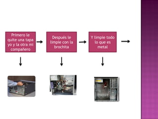 Dos personas limpiaron una grabadora removiendo las tapas, limpiando el interior con una brochita y asegurándose de limpiar bien la parte donde se insertan los discos. Cada uno puso una tapa aunque les costó trabajo, y finalmente completaron la tarea de limpiar la grabadora.
