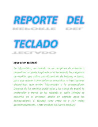 El teclado es un periférico de entrada para computadoras que utiliza una disposición de teclas para enviar información. Está dividido en cuatro bloques: el bloque de funciones con teclas F1-F12, el bloque alfanumérico con letras y números, el bloque especial con teclas como Imprimir y flechas, y el bloque numérico con números como una calculadora. El teclado permite la interacción principal con las computadoras después de las tarjetas perforadas y cintas de papel.