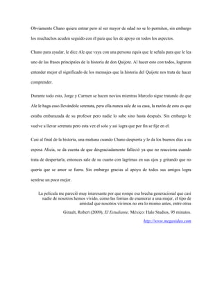 La película cuenta la historia de Chano, un hombre de 70 años que decide estudiar literatura en la universidad. Al principio le cuesta integrarse con los estudiantes más jóvenes, pero poco a poco se gana su amistad a través de la poesía y consejos sobre el amor. Aunque no puede participar en una obra de teatro por su edad, ayuda a los demás a comprender mejor la obra. Al final, Chano se entristece cuando su esposa fallece, pero sus amigos lo apoyan.