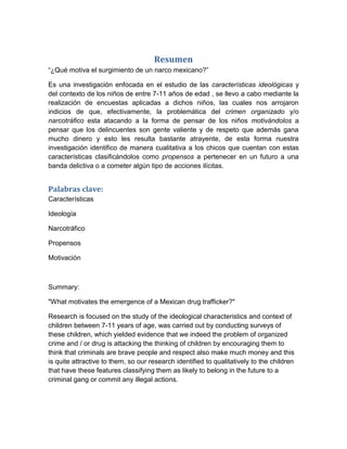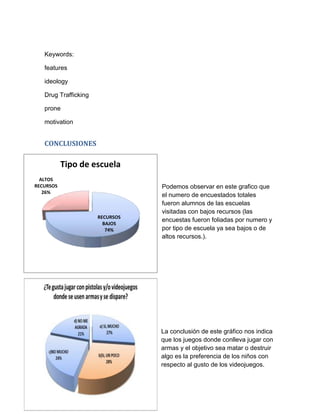 El documento presenta los resultados de una investigación sobre los factores que motivan a los niños entre 7 y 11 años a querer convertirse en narcotraficantes en el futuro. La investigación aplicó encuestas a niños y encontró que están siendo influenciados por la "narco cultura", viendo a los delincuentes como gente valiente y exitosa que gana mucho dinero. Esto los hace más propensos a unirse a grupos delictivos. El documento incluye gráficos sobre los resultados de las encuestas respecto a sus preferencias en videojuegos, pelí