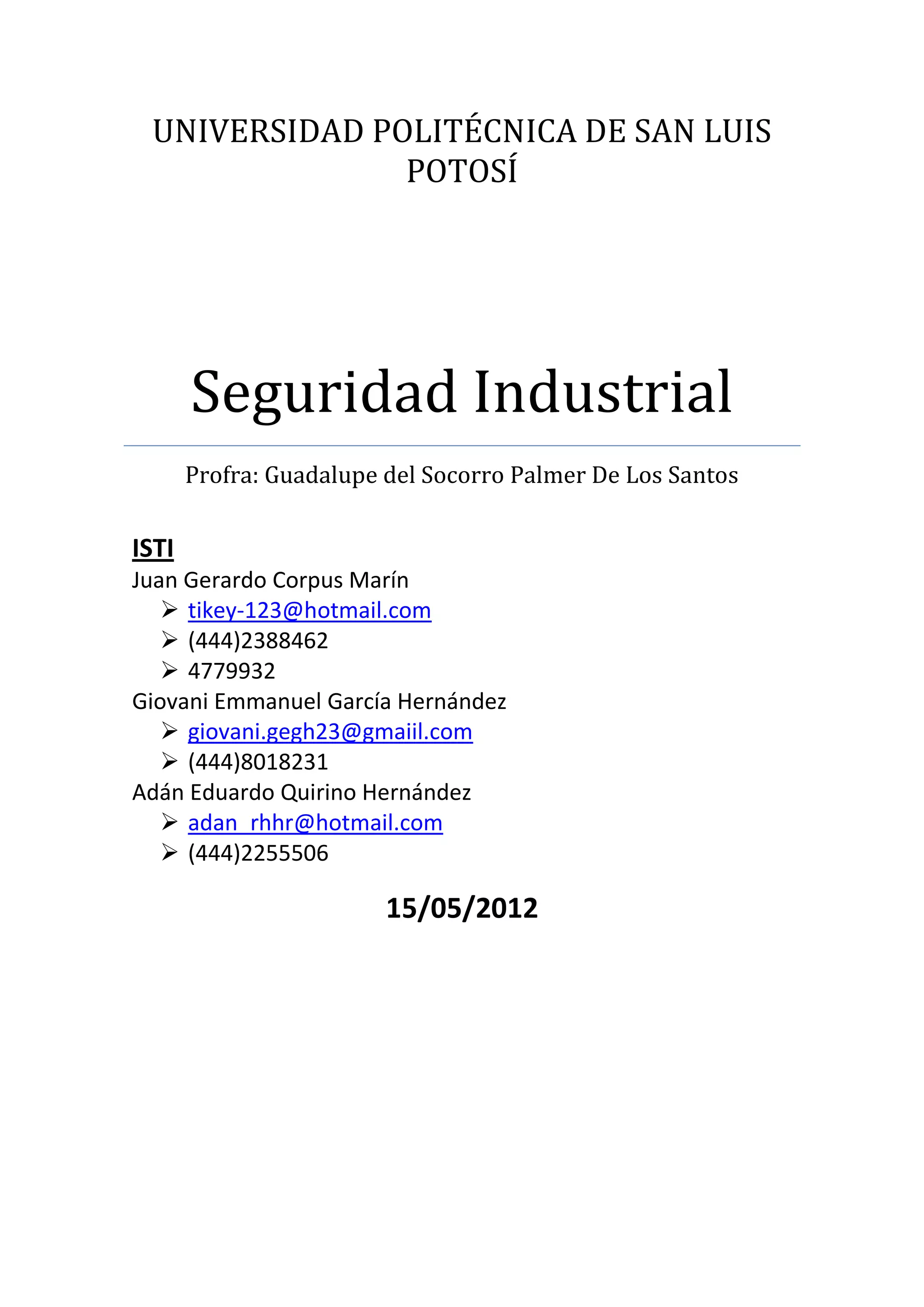 Este documento presenta un resumen de una investigación sobre seguridad industrial realizada por estudiantes de la Universidad Politécnica de San Luis Potosí. El resumen incluye los objetivos, métodos y resultados clave de la investigación, la cual evaluó si la empresa Concept House brindaba información adecuada a los trabajadores sobre seguridad. Los estudiantes aplicaron encuestas a 100 trabajadores y encontraron que, a pesar de que unos pocos dijeron que la empresa les recordaba constantemente las normas de seguridad, la mayoría respondió que no.