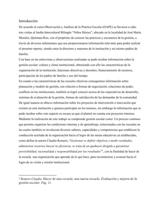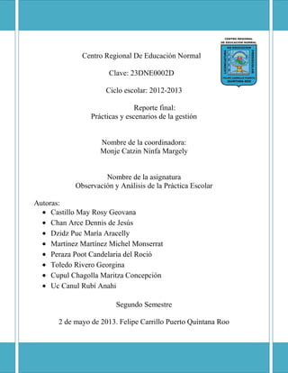 Este documento presenta un resumen del reporte final del curso de Observación y Análisis de la Práctica Escolar realizado en el Centro Regional de Educación Normal en el ciclo escolar 2012-2013. Se describen las características de la gestión escolar y las escuelas efectivas en el Jardín de Niños "Niños Héroes" en José María Morelos, Quintana Roo, basado en entrevistas con la directora y maestras.