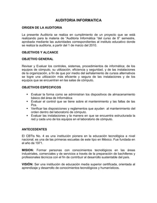 El resumen evalúa el centro de cómputo del CBTIs N°4 identificando varias deficiencias como falta de presupuesto, personal, un espacio más amplio y ventilación adecuada. También encuentra que no existe un calendario de mantenimiento. La auditoría revisa la estructura de distribución de equipos, su utilización y condición durante marzo a mayo de 2010 para mejorar la seguridad física, disponibilidad y privacidad de la información.