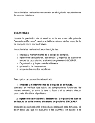 Este documento presenta el reporte final de servicio social de Joahana Andrea Bautista Hernández en la Escuela Primaria "Venustiano Carranza". Durante los meses de febrero a agosto, la autora realizó varias actividades de apoyo como limpiar y dar mantenimiento a las computadoras de la escuela, ingresar calificaciones de los estudiantes al sistema SINCEREP, organizar la biblioteca, generar documentos para los maestros, y apoyar eventos escolares. En la conclusión, la autora resume que el reporte describe detalladamente las divers