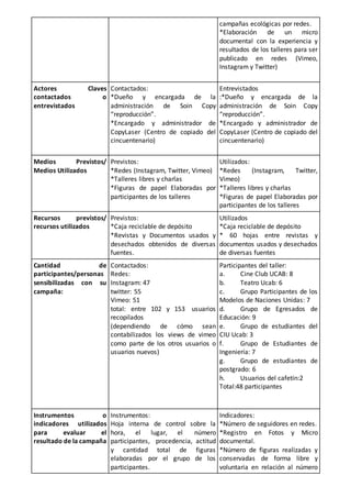 Este documento presenta el informe de una campaña de concientización sobre el uso prolongado del papel realizada en la Universidad Católica Andrés Bello. La campaña consistió en charlas y talleres para promover el máximo aprovechamiento del papel en preparación para futuros sistemas de reciclaje. Se realizaron actividades con diversos grupos universitarios y se utilizaron redes sociales. La campaña superó las expectativas de participación y generó interés sobre el tema.