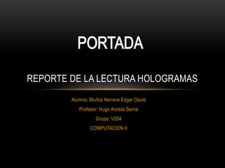 Los hologramas son fotografías tridimensionales creadas mediante la interferencia de luz láser reflejada por un objeto y una luz de referencia capturada en una película, dando la apariencia de que la imagen flota en el espacio. Actualmente se está desarrollando la televisión holográfica que permite crear hologramas reescribibles y experiencias pseudo-holográficas como HoloTV que proyectan imágenes volumétricas en una pantalla de luz.