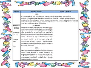 Este documento describe una actividad educativa con niños de 3er grado sobre figuras geométricas. La actividad busca fortalecer el conocimiento de los niños sobre las propiedades de figuras como triángulos, cuadrados y círculos mediante juegos. El propósito es desarrollar la destreza mental de los niños identificando formas geométricas en objetos cotidianos y comparando sus semejanzas y diferencias.