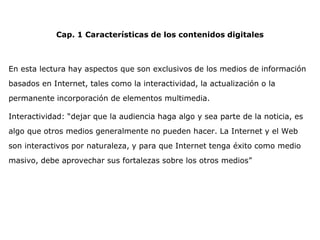 Este documento describe las características fundamentales de los contenidos digitales. Algunas de estas características incluyen la interactividad, la capacidad de actualización, la inclusión de múltiples medios como audio y video, y la no linealidad que permite al usuario acceder al contenido en cualquier orden. También señala que los usuarios juegan un papel activo al distribuir contenido y crear contenido propio en estos medios.
