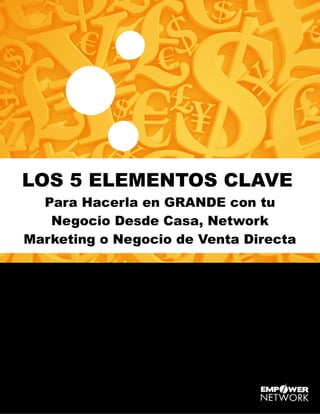 Este documento resume los 5 elementos clave para tener éxito en un negocio desde casa, network marketing o venta directa según David Wood. Estos incluyen: 1) dominar las técnicas de venta y patrocinio, 2) mejorar la actitud y creencias, 3) seguir un sistema para construir relaciones rápido, 4) conectar con los deseos profundos de los clientes, y 5) definir una visión clara y perseguirla sin descanso. El autor ofrece un manual con su fórmula probada por $7.