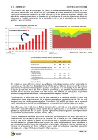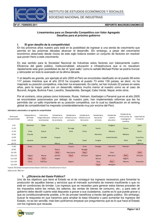Este documento discute cuatro factores clave que limitan la competitividad y el crecimiento económico de Perú: 1) la eficiencia del gasto público, que se ha destinado principalmente al gasto corriente en lugar de la inversión; 2) la institucionalidad, especialmente la necesidad de mejorar el sistema de justicia; 3) la educación y la empleabilidad, dado que más de dos tercios de la fuerza laboral carecen de educación técnica o superior; y 4) la infraestructura, que es esencial para impulsar la