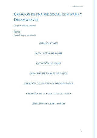 Este documento resume la creación de una red social utilizando WAMP y Dreamweaver. Detalla la instalación de WAMP, su ejecución y configuración. Luego explica la creación de una base de datos en PHPMyAdmin con tablas como usuarios, publicaciones y comentarios. Finalmente, describe la creación de páginas como index, perfil y registro usando Dreamweaver y conectándolas a la base de datos.