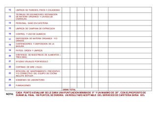 El resumen semanal de la cafetería revisa 26 elementos clave relacionados con la limpieza, presentación de alimentos y empleados, procesamiento y almacenamiento de alimentos, equipos e instalaciones, y control de plagas. Cada elemento se califica de 0 a 20 puntos para obtener una puntuación total de 100 puntos, considerándose aceptable una puntuación de al menos 85 puntos. El informe proporciona una evaluación integral de las operaciones de la cafetería para garantizar la higiene y seguridad alimentaria.