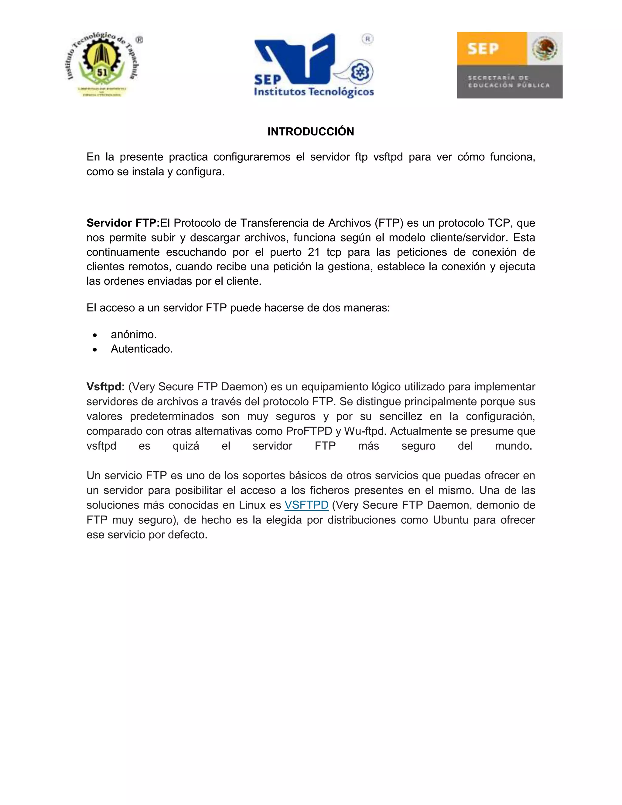 El documento describe la instalación y configuración de un servidor FTP VSFTPD. Se instala el software VSFTPD, se crean usuarios FTP y se les asignan carpetas. Luego, se configura el archivo VSFTPD.conf para habilitar el acceso anónimo y de escritura, y enjaular a los usuarios en sus carpetas. Finalmente, se prueba el acceso FTP de forma exitosa desde un navegador y terminal para varios usuarios.