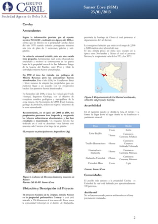 Sunset Cove Mining Inc. está realizando una colocación de acciones para recaudar $1 millón y continuar la exploración de su proyecto minero Carolay en Perú. Recientemente confirmaron la continuidad de una veta mineralizada de 450 metros. Próximamente publicarán un reporte técnico que estimará los recursos minerales del proyecto por primera vez. El objetivo de la compañía es avanzar el proyecto Carolay hacia el desarrollo mediante estudios de exploración y valuación de recursos.