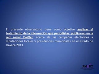 Este documento presenta los resultados de un análisis de 468 publicaciones realizadas por 4 periodistas de Oaxaca en Twitter sobre las campañas electorales estatales de 2013. La mayoría de las publicaciones (31%) se referían a la coalición Unidos por el Desarrollo, y se centraron en candidatos a alcalde de Oaxaca como Francisco Reyes. Solo el 3% mencionó candidatas mujeres. Mientras que el 77% de los tweets solo informaron sobre actos de campaña, el 18% apoyó explícitamente a algunos candidatos.