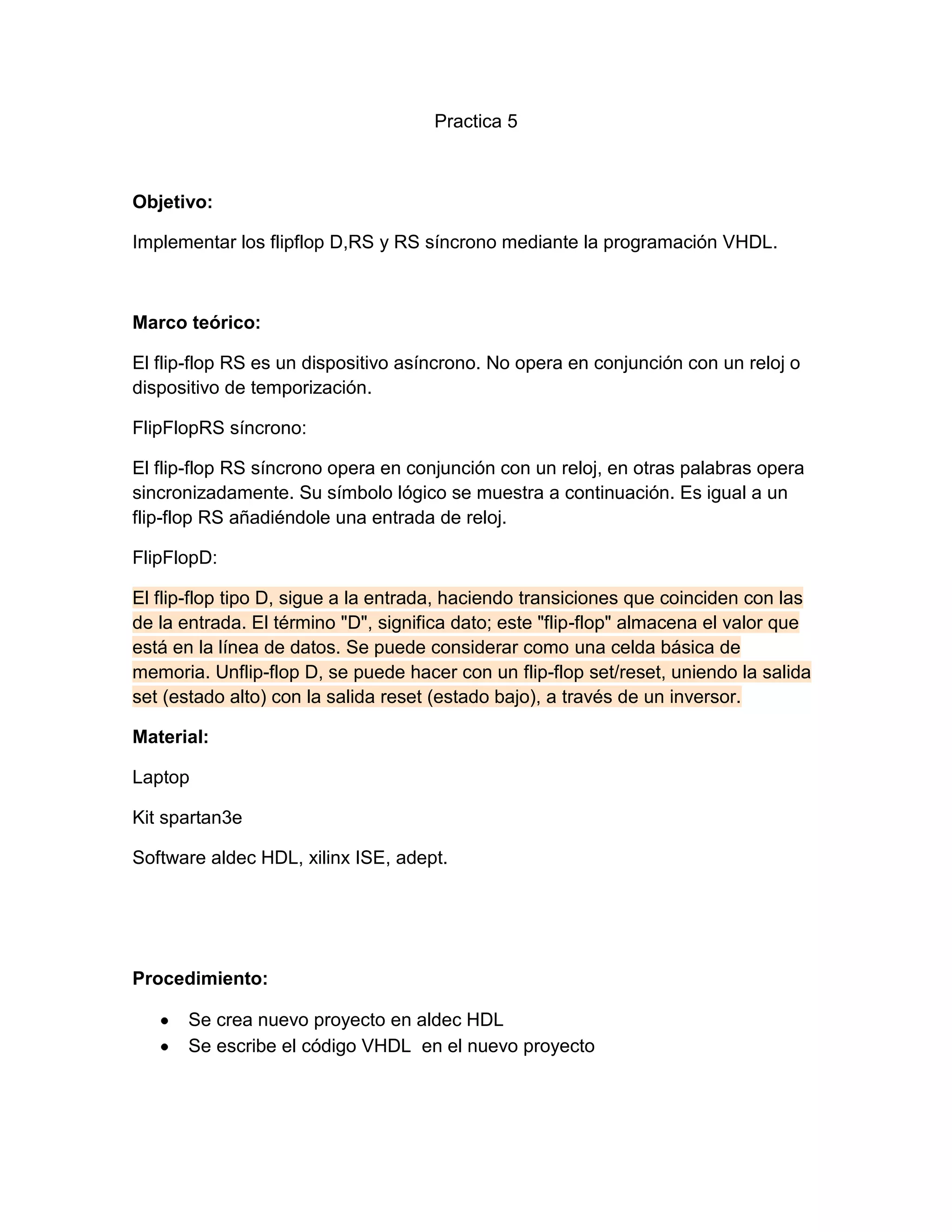 Este documento describe la implementación de flip-flops D, RS y RS síncrono mediante código VHDL. Se creó un proyecto en Aldec HDL y se escribió el código VHDL para cada tipo de flip-flop. El código fue probado en un kit Spartan3E y se logró implementar con éxito los flip-flops en un kit Basys 2, aunque inicialmente hubo problemas al conectar una salida externa e interna que se resolvieron separando la salida con dos inversores.