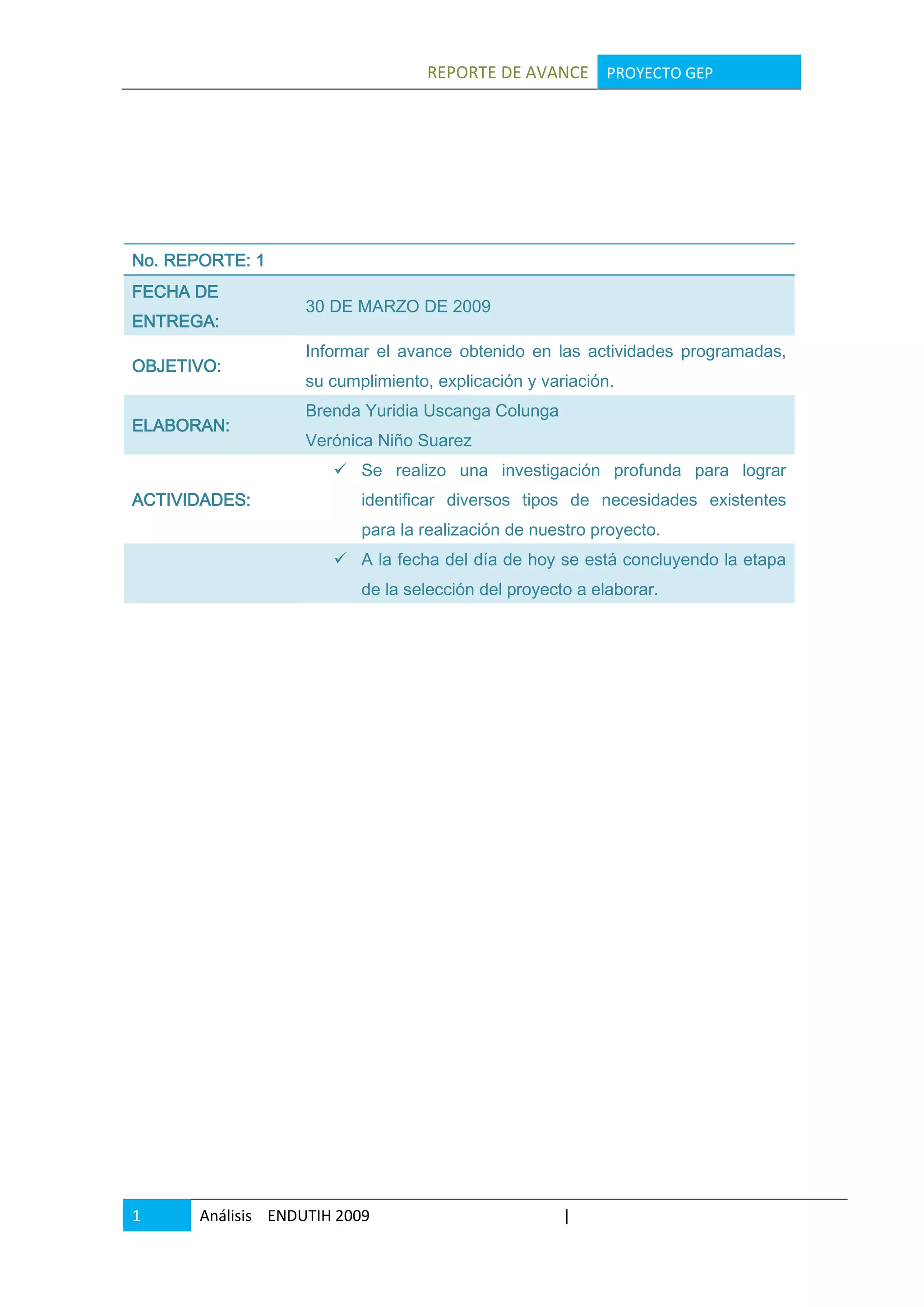Se presenta un informe sobre el progreso de actividades programadas al 30 de marzo de 2009. La investigación para identificar necesidades del proyecto está completa. Actualmente se está concluyendo la selección del proyecto específico a desarrollar.