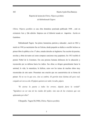 Rabindranath Tagore fue un escritor, pintor y educador indio que recibió el Premio Nobel de Literatura en 1913. Chitra; Pájaros perdidos es una de sus obras de teatro poéticas publicada en 1948 que presenta poemas profundos en verso y prosa sobre temas como la amistad, la vida y la naturaleza. La obra involucra a varios personajes humanos y dioses y describe paisajes y ambientes de una manera bella a pesar de tratar momentos tristes o incómodos de la vida.