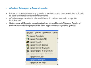 El documento describe los pasos para crear una base de datos en Access, agregar una tabla y campos, y luego crear un reporte en Visual Basic para mostrar los datos de la tabla. Se agregan controles de botón para agregar, eliminar y ver registros, y se incluye código para conectarse a la base de datos y realizar las acciones correspondientes a cada botón.