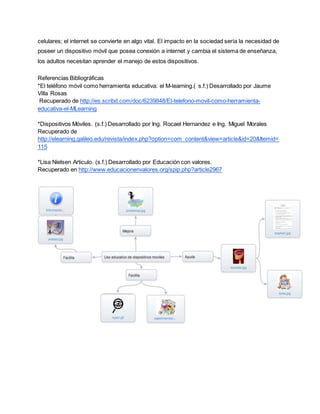 El documento habla sobre el uso educativo de los dispositivos móviles en las aulas. Explica que la implementación de la tecnología móvil en la enseñanza surgió en el siglo 21 debido al avance tecnológico. El sistema educativo tradicional se volvió poco efectivo, por lo que se optó por modernizarlo con el uso de dispositivos móviles a través del movimiento llamado M-Learning. El documento también señala que los dispositivos pueden ser útiles para la comprensión de los estudiantes y como record