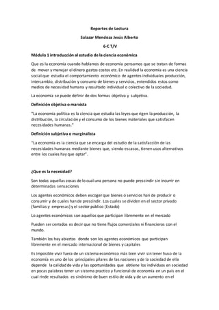 Este documento resume los conceptos clave de cuatro módulos sobre economía. Explica brevemente que la economía estudia la producción, distribución, intercambio y consumo de bienes y servicios. Define la economía de forma objetiva y subjetiva. Luego resume conceptos micro y macroeconómicos como oferta y demanda, PIB, PNB, inflación y sistema monetario. Finalmente, define la globalización como el creciente grado de interdependencia económica entre países del mundo.