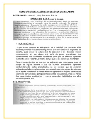 Este documento presenta 15 puntos de vista sobre temas lingüísticos relacionados con la enseñanza del lenguaje. El autor argumenta que la enseñanza de la gramática de manera arbitraria y memorística no es efectiva y que en su lugar se debe enfatizar el desarrollo de habilidades comunicativas. También discute diversas teorías lingüísticas y cómo estas podrían aplicarse de manera más efectiva en el aula para mejorar la comprensión y expresión escrita de los estudiantes.