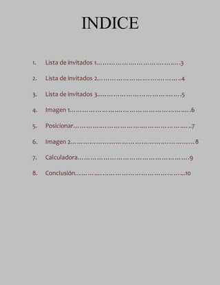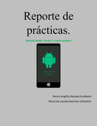 Este documento presenta un reporte de prácticas realizadas en Android Studio sobre listas de invitados, imágenes, posicionamiento y una calculadora. Explica el uso de varios componentes como TextView, ImageView, LinearLayout y OnClick. La conclusión señala que trabajar en Android Studio fue estresante debido a problemas con las computadoras de la escuela pero interesante y se quiere aprender más sobre la plataforma.