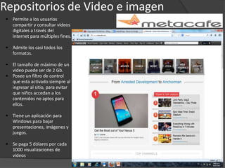 Un repositorio es un sitio centralizado para almacenar y mantener información digital como bases de datos o archivos. Puede contener o no restricciones de acceso y gestiona paquetes con metadatos. Algunos repositorios permiten compartir videos, audios, documentos u otros contenidos y ofrecen funciones como filtros de control, descargas de aplicaciones, generación de códigos y acceso a comunidades para compartir información.