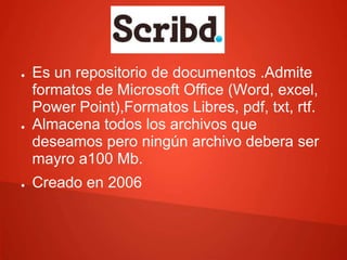 Este documento describe varios repositorios populares para almacenar y compartir diferentes tipos de archivos digitales de forma gratuita. Scribd, Slideshare e Issuu son repositorios para documentos como presentaciones, libros y revistas, mientras que Flickr, Ivoox y YouTube son repositorios para almacenar y compartir fotos, audios y videos respectivamente. La mayoría de estos sitios permiten subir archivos de hasta 100MB y fueron creados entre 2004 y 2006.