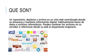 Un repositorio es un sitio web centralizado donde se almacena y mantiene información digital como bases de datos o archivos. Google Drive y OneDrive de Microsoft son servicios de almacenamiento en la nube que permiten guardar archivos en línea y acceder a ellos desde cualquier lugar, mientras que Dropbox y Box son servicios similares principalmente para empresas. Cada servicio ofrece diferentes cantidades de almacenamiento gratuito y de pago, así como compatibilidad con diferentes sistemas operativos y aplicaciones.