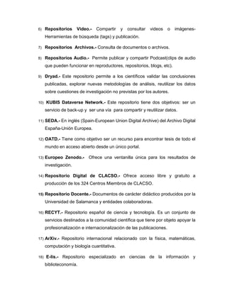 El documento describe los tipos de repositorios web, que son sitios centralizados donde se almacena y mantiene información digital. Explica que pueden ser de acceso público o privado y que los más comunes son los académicos e institucionales, cuyo objetivo es organizar, archivar, preservar y difundir la producción intelectual de una entidad. A continuación, enumera y brinda una breve descripción de 26 tipos de repositorios, incluyendo repositorios de archivos, audio, video, datos científicos y tesis
