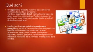 Un repositorio web es un sitio centralizado para almacenar y mantener información digital, útil para comunidades específicas. Se presentan diferentes servicios de almacenamiento en la nube, como Google Drive, OneDrive, Dropbox y Box, cada uno con ventajas y desventajas en cuanto a facilidad de uso, integración y almacenamiento. La elección entre estos servicios depende de las necesidades del usuario, como compatibilidad con dispositivos, capacidad de almacenamiento y herramientas de colaboración.