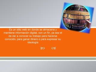 Un sitio web es un lugar digital donde la información se almacena y mantiene con el fin de hacerse conocido, ganar dinero o expresar una ideología. Los sitios web pueden ser usados con diferentes propósitos y contextos, son accesibles, duraderos y permiten generar nuevos derivados. Existen diferentes tipos de sitios web como los de licencia libre, privativa, institucionales o temáticos.
