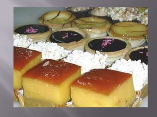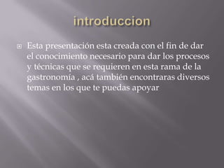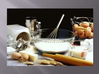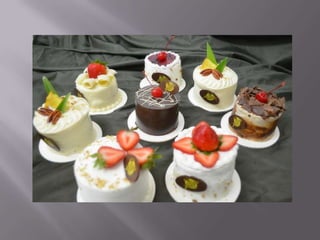Este documento presenta información sobre la repostería. Define la repostería como el arte de preparar y decorar pasteles y postres dulces. Explica que la repostería se basa en recetas antiguas y describe algunas recetas tradicionales españolas del siglo XIX. También describe los procesos y técnicas comunes en la repostería como el uso de levadura o bicarbonato para hacer los pasteles esponjosos en lugar de densos.