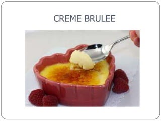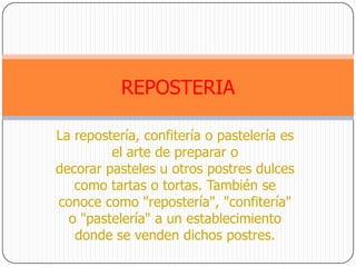 La repostería es el arte de preparar pasteles y otros postres dulces como tartas o tortas. Se menciona que la repostería también se refiere a un establecimiento donde se venden dichos postres. Finalmente, se lista una variedad de postres como creme brulee, pay de fresa, pastel de fresa, pay de limón, cheesecake, arroz con leche, gelatina, canapés de frutas y pastel de cajeta, y se invita a visitar un blog para conocer más recetas.