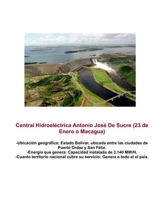 El documento presenta información sobre las principales represas hidroeléctricas de Venezuela, incluyendo Simón Bolívar, Antonio José de Sucre, y Francisco de Miranda. Describe la ubicación, energía generada, y territorio cubierto por cada represa. También incluye gráficos sobre represas en general y la distribución de electricidad desde las represas a los hogares.