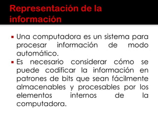 Una computadora es un sistema automatizado para procesar información que se codifica en patrones de bits. La información puede ser en formato de texto, sonido, imágenes o valores numéricos, cada uno con sus particularidades en su representación y almacenamiento. La notación binaria es la más eficiente para el almacenamiento de datos numéricos, permitiendo un rango significativamente mayor que el de la codificación de caracteres.