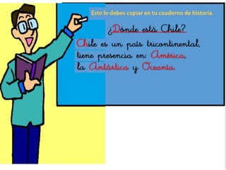 Chile se encuentra en el extremo suroccidental de América del Sur. Limita al norte con Perú y Bolivia, al este con Argentina, y al oeste está bañado por el Océano Pacífico. La capital y ciudad más grande de Chile es Santiago, ubicada casi en el centro geográfico del país. El documento proporciona información básica sobre la ubicación de Chile en relación con otros países de América del Sur y desafía a los lectores a reforzar lo que aprendieron completando actividades después de la presentación.