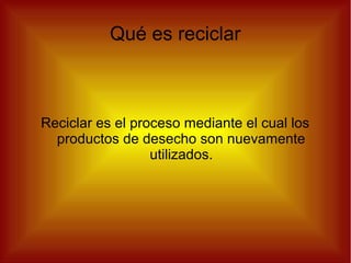 Este documento describe el proceso de reciclaje y las razones para reciclar. Explica que el reciclaje permite reutilizar productos de desecho. Algunas de las razones para reciclar son que reduce la cantidad de residuos en los vertederos, ahorra energía y recursos naturales como el petróleo. Luego, detalla los principales materiales que se pueden reciclar como papel, plástico, vidrio, metal, pilas, residuos orgánicos y electrónicos.