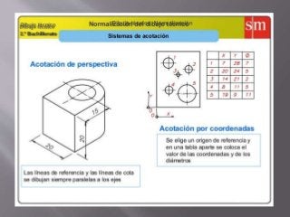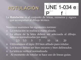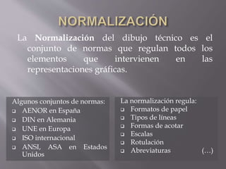 El documento describe los diferentes tipos de dibujo y representación de proyectos tecnológicos. Explica el dibujo artístico frente al dibujo técnico, y cubre temas como la normalización, herramientas de dibujo, tipos de líneas, acotación, vistas planas e isométricas. También incluye ejemplos de escalas y cómo calcularlas.