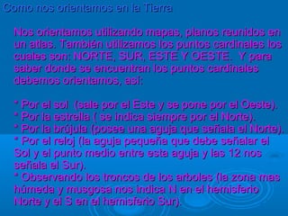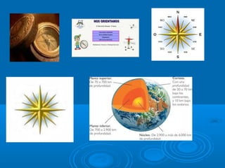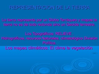 El documento resume los principales conceptos relacionados con la representación y estructura de la Tierra. Explica que la Tierra se representa mediante globos terráqueos y mapas, y no es perfectamente redonda sino un geoide. Además, describe las capas de la atmósfera, la hidrosfera, la litosfera y cómo nos orientamos utilizando puntos cardinales y otros métodos como el sol, las estrellas y la brújula. Finalmente, resume la estructura interna de la Tierra que consta de la corteza, el manto