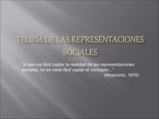 El documento resume los conceptos clave de Serge Moscovici sobre las representaciones sociales. Moscovici propuso que las representaciones sociales son modalidades de conocimiento que permiten a los individuos comprender y comunicarse sobre la realidad social. Las representaciones sociales son sistemas simbólicos compartidos que influyen en cómo las personas perciben y actúan en el mundo. Moscovici también destacó el papel fundamental de la comunicación y la interacción social en la construcción colectiva de la realidad.