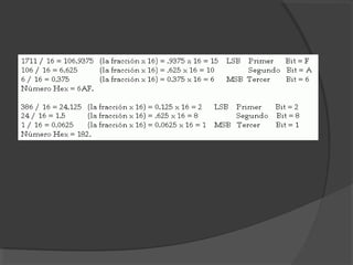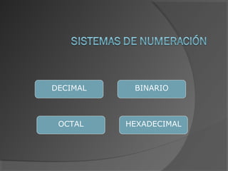 Este documento describe los diferentes sistemas de numeración, incluyendo decimal, binario, octal y hexadecimal. Explica cómo representar números enteros con y sin signo en binario, y cómo convertir entre los diferentes sistemas de numeración, como convertir decimal a binario, binario a octal, etc.