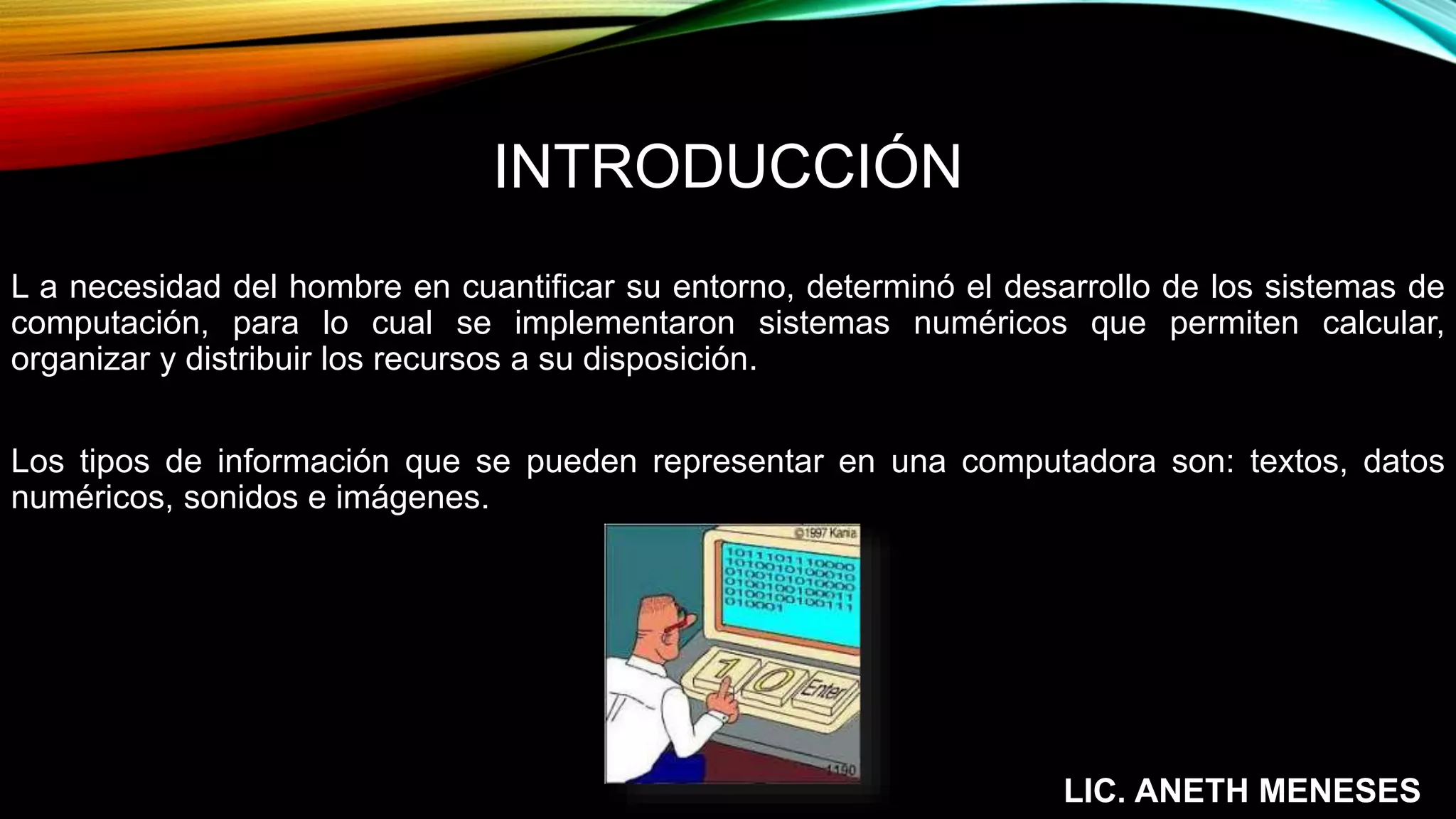 Este documento describe los diferentes sistemas numéricos utilizados para representar información en las computadoras, incluyendo el sistema binario, decimal, hexadecimal y octal. Explica cómo cada sistema utiliza diferentes símbolos y valores para representar números, y proporciona ejemplos de cómo convertir entre sistemas numéricos, como convertir un número decimal a su equivalente binario, hexadecimal u octal.