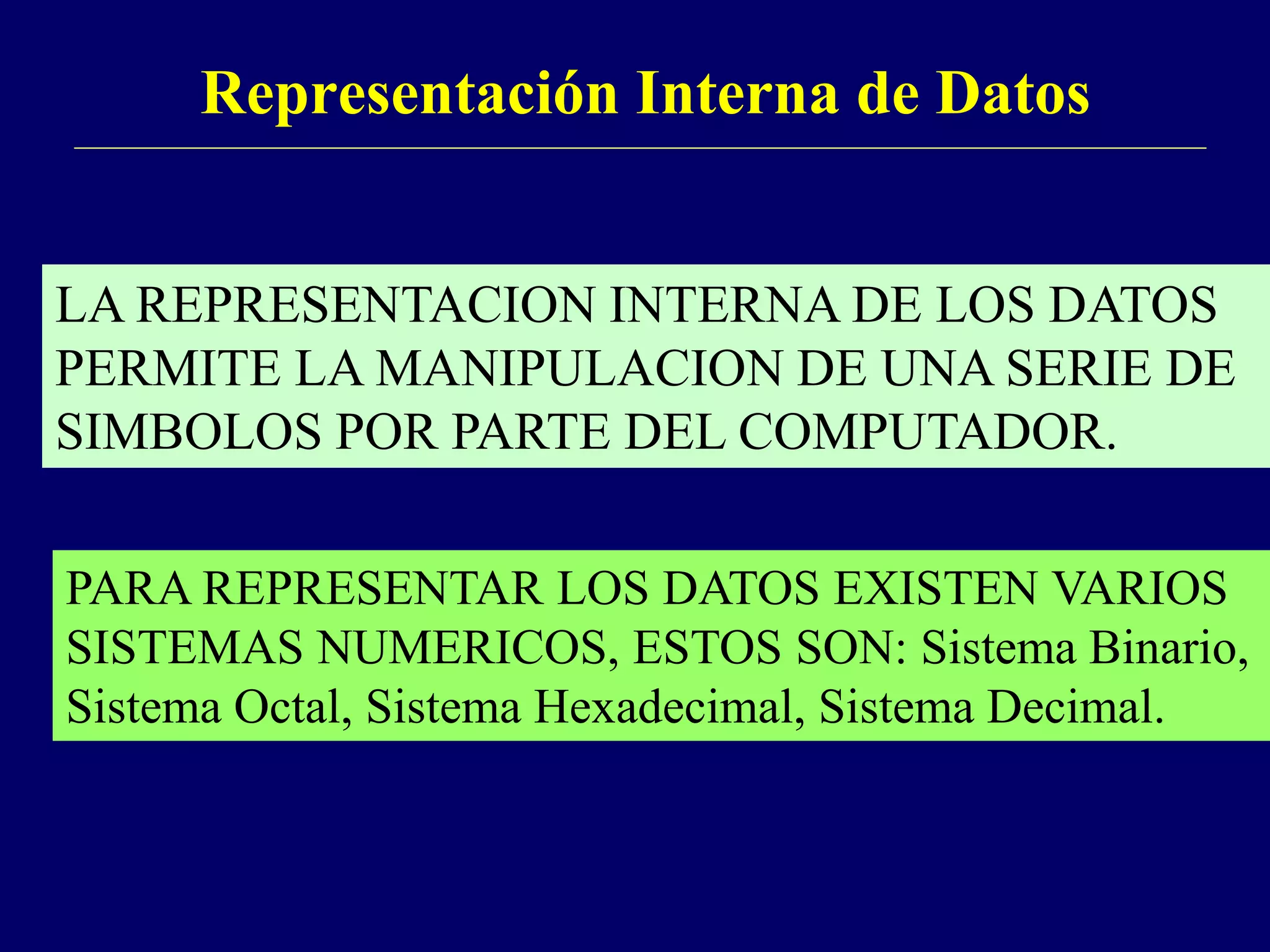 La representación interna de datos permite que los computadores manipulen símbolos. Existen varios sistemas numéricos para representar datos, incluyendo el sistema binario, octal, hexadecimal y decimal. Cada sistema utiliza diferentes símbolos y reglas para representar cantidades numéricas.